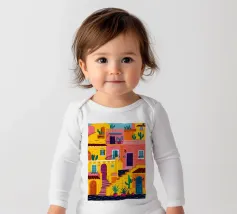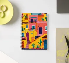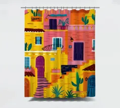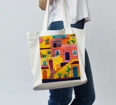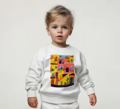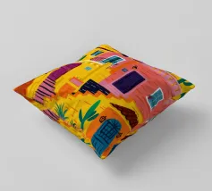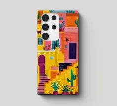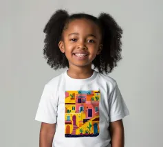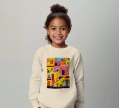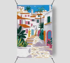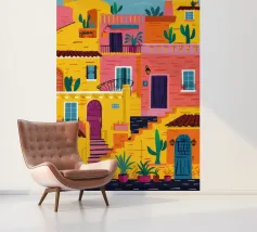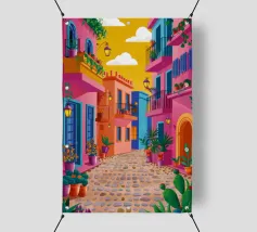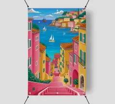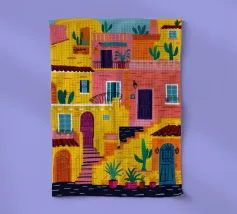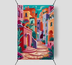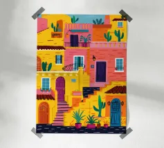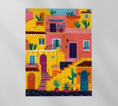 Un'illustrazione vibrante e dettagliata di una città collinare simile a un labirinto, con case colorate, scale e piante ovunque. La scena è una rappresentazione gioiosa, energica e complessa di una vivace comunità mediterranea.