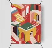 Un complesso e impossibile labirinto architettonico di scale, archi e porte dai colori vivaci.