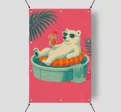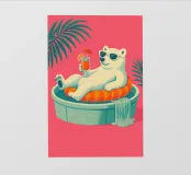 Un'illustrazione stravagante e vivace di un orso polare che vive la sua vita migliore: occhiali da sole, cocktail nella zampa e galleggiante in una piscina per bambini con una mini cascata. Su uno sfondo tropicale rosa caldo, quest'opera d'arte dona un tocco di umorismo e vibrazioni rilassanti a qualsiasi spazio. Perfetto per gli amanti dell'arte eccentrica, dell'estetica retrò e dell'atteggiamento rilassato. Che sia per il salotto, l'ufficio o la casa estiva, questo pezzo garantisce sorrisi.