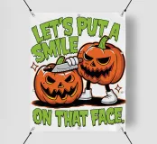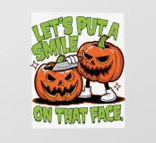 Due zucche maliziose con ghigni minacciosi. La frase "Let's put a smile on that face" (mettiamo un sorriso su quella faccia) è riportata in grassetto, a caratteri scherzosi.