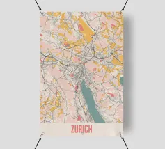Una mappa artistica di Hong Kong che cattura l'armoniosa combinazione di paesaggio urbano e costa con strutture e colori chiari.