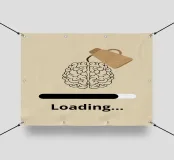 Un cervello viene raffigurato mentre viene riempito di caffè da un bricco, accompagnato da una barra di caricamento sottostante. L'illustrazione suggerisce con umorismo il bisogno di caffè della mente per funzionare correttamente.