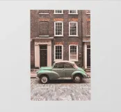 In una pittoresca strada di Londra, un'elegante auto d'epoca passa davanti a facciate di mattoni con un'atmosfera retrò e senza tempo dell'architettura britannica, mescolando storia e nostalgia urbana.