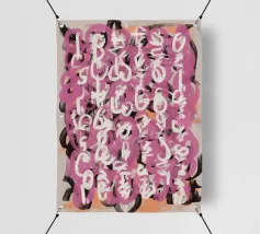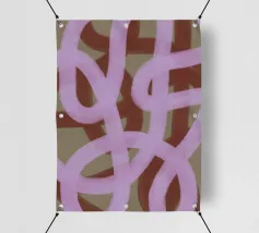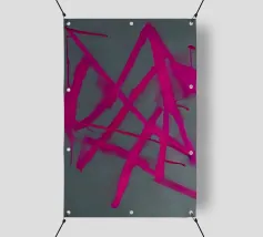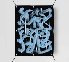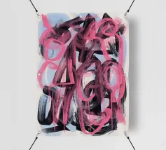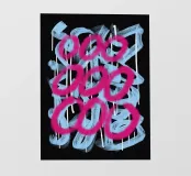 Vivaci pennellate rosa formano forme ad anello su uno sfondo di vernice blu pallido su un fondale nero. Gocce di vernice bianca scendono dagli accumuli di colore più spessi, dando un senso di movimento alla composizione.