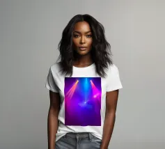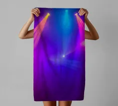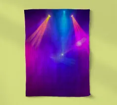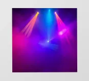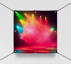 Vibranti fasci di luce colorata penetrano attraverso una nebbia, creando un'atmosfera energica in un luogo vivace durante un evento notturno, probabilmente un concerto o uno spettacolo.