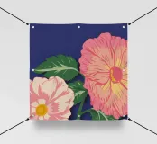 Una vista macro e ravvicinata di grandi fiori rosa, forse peonie o dalie, con accenni di bianco e giallo. Lo sfondo è di un blu marino intenso, che crea un contrasto drammatico con i fiori delicati e vibranti.