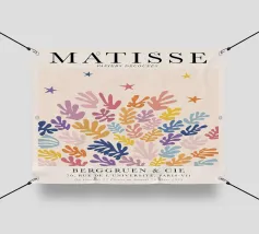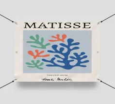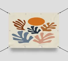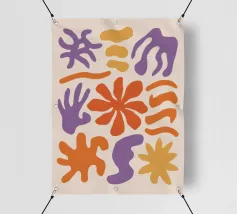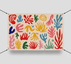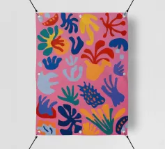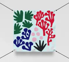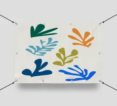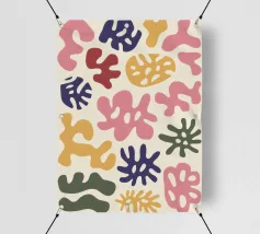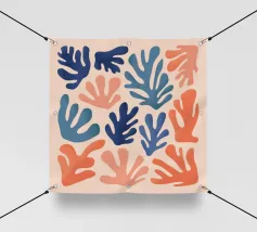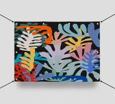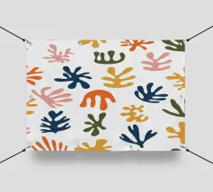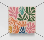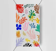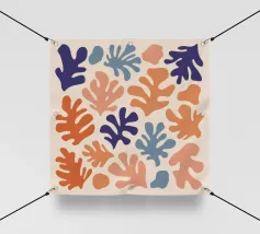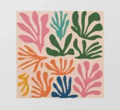 Un motivo di foglie stilizzate nei toni del verde, del rosa e della terracotta, ispirato ai ritagli di Henri Maraoui. La disposizione suggerisce una danza aggraziata di forme botaniche.