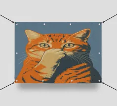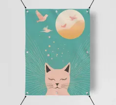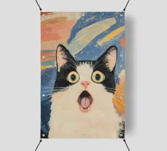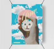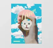 Umano che si trasforma lentamente in un gatto dalla pelliccia bianca, vedendosi per la prima volta in uno specchio tascabile (con i baffi e gli occhi da gatto). Surreale e divertente collage tipografico di MsGonzalez