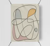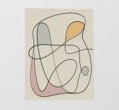 Linee nere curve si intrecciano su uno sfondo neutro, formando forme astratte riempite di colori tenui come l'arancione, il grigio e il rosa. La composizione emana un senso di fluidità e movimento.