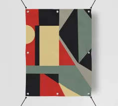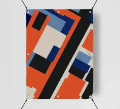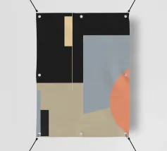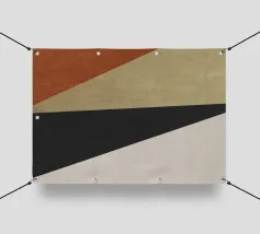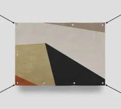 Forme geometriche astratte formano una composizione con audaci linee diagonali che si intersecano in vari angoli. La tavolozza è composta da toni tenui, tra cui nero, grigio, beige e ruggine.