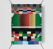 Una composizione di motivi geometrici presenta un cerchio con audaci strisce verticali rosse, gialle e verdi, intersecato da barre orizzontali e circondato da una varietà di rettangoli a scacchi e a tinta unita. Un mix di colori vivaci e tenui, insieme a linee nette, sono i motivi che caratterizzano la composizione.