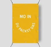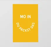 Scoprite il poster motivante "MOIN - DU PACKST DAS". Questo design creativo ed energico combina una tipografia semplice con un messaggio positivo. Su uno sfondo giallo caldo, la scritta "MO IN" spicca in caratteri maiuscoli bianchi e decisi. Direttamente sotto di essa, "DU PACKST DAS" è disposta in una linea curva e semicircolare che ricorda visivamente un sorriso.
