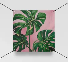 Natura morta contemporanea di una pianta di monstera in un vaso blu. Lo sfondo è un'audace composizione di forme astratte a colori bloccati nei toni della terra, che fonde forme naturali e arte moderna.