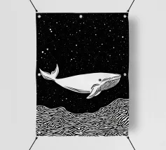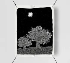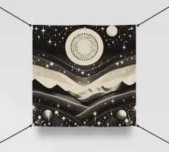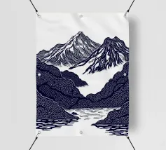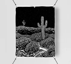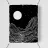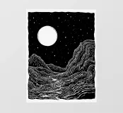 Questa stampa in bianco e nero in stile linoleografia ritrae un ipnotico paesaggio notturno. Una luna piena splendente domina il cielo stellato, proiettando la luce su un fiume tortuoso che scorre tra montagne aspre e strutturate. L'intricato lavoro al tratto crea un senso di movimento e profondità, evocando mistero e tranquillità.