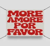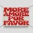 Design tipografico con la scritta "MORE AMORE FOR FAVOR" in grandi lettere rosse arrotondate su uno sfondo beige chiaro. Impilate verticalmente e leggermente sfalsate, le lettere 3D creano profondità, dinamismo e una dichiarazione moderna e accattivante.
