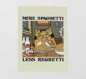 Questa giocosa opera d'arte raffigura un gatto soddisfatto che si gode un abbondante piatto di spaghetti, irradiando conforto e umorismo. Con il suo stile retro comico e la frase spiritosa "Più spaghetti, meno rimpianti", ricorda di assaporare i semplici piaceri della vita. Perfetto per gli amanti del cibo, per gli appassionati di gatti e per tutti coloro che apprezzano una motivazione spensierata.