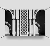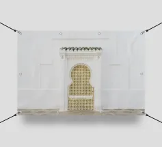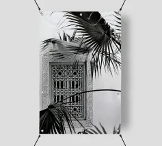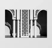 Architettura marocchina in bianco e nero. Archi di una moschea. Ombra sul muro. Decorazione in stile arabo.