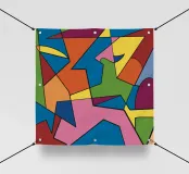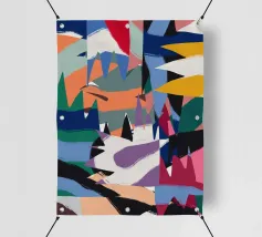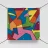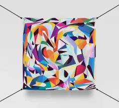 Forme geometriche di vari colori segmentano ordinatamente lo spazio, creando un mosaico di forme astratte. Sfumature di blu, verde, viola, rosso e giallo si intersecano con i contorni neri per dare un effetto vetro colorato.