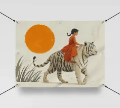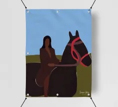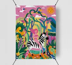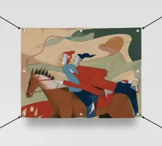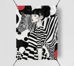 Dipinto vintage di una donna in elegante abito rosso che cavalca la sua zebra verso l'orizzonte al tramonto. Collage a tecnica mista di MsGonzalez