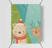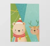Allegra illustrazione con un orso e un cervo che indossano abiti natalizi accanto a un albero di Natale, irradiando allegria e felicità nel giorno di Natale.