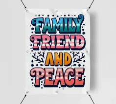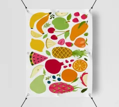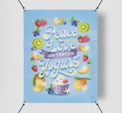 Una citazione divertente con tanta frutta disegnata a mano per la cucina o la zona pranzo. Pace, amore e yogurt gelato. Un motivo tipografico davvero unico. Le lettere sono disegnate a mano e colorate con i freschi e rinfrescanti colori del gelato. La cornice è formata da frutti come mirtilli, kiwi, fragole, mango, lamponi e fiori di vaniglia. È anche un disegno molto bello e adatto per un dolce caffè, per una gelateria, per un grazioso bistrot o ristorante.