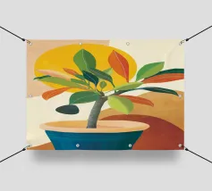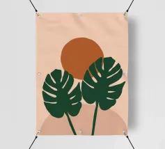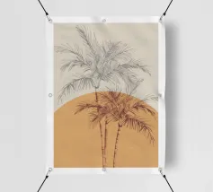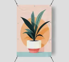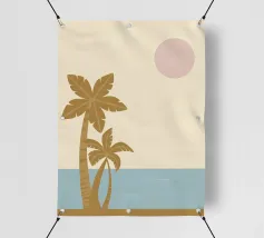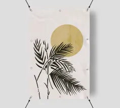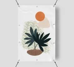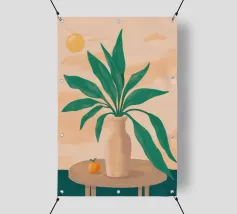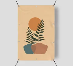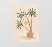 Illustrazione minimalista e chic di una palma in vaso su un morbido sfondo beige. Le linee pulite e la composizione semplice ne fanno un'opera d'arte botanica elegante e senza tempo.