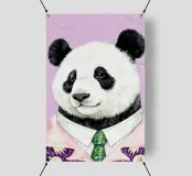 Un affascinante panda vestito con giacca e cravatta a fantasia, che porta un tocco di umorismo e raffinatezza.