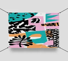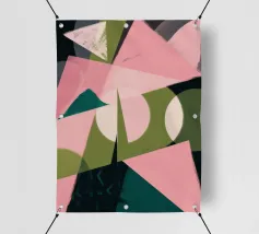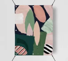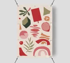 Una composizione moderna e astratta caratterizzata da un patchwork di vari motivi e forme. Gli elementi includono forme organiche simili a foglie, griglie geometriche e texture astratte in una tavolozza tenue di rosa, nero e beige, che riflette uno stile bohémien ed eclettico.