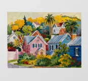 Un villaggio di case colorate di rosa, blu e giallo è adagiato sul fianco di una collina; la scena è composta come un'allegra trapunta patchwork di colori e forme, che emana un senso di comunità e gioia.