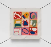 Una composizione astratta moderna e giocosa, caratterizzata da una disposizione a griglia di forme organiche e colorate. L'opera si presenta come un puzzle sofisticato ed equilibrato di forme e colori.