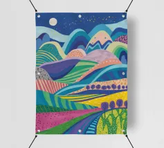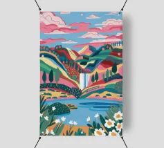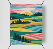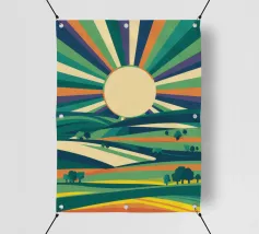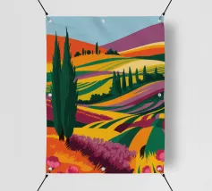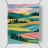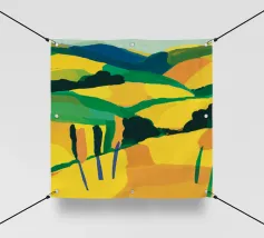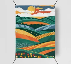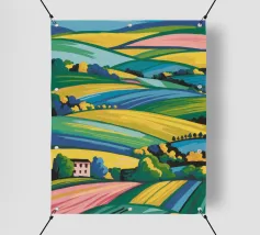 Un dipinto paesaggistico espressivo e vibrante di campi ondulati, simili a patchwork, nei toni del verde, del giallo e del rosa. Lo stile pittorico cattura la bellezza dinamica e la consistenza della campagna.