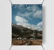 Un sentiero sterrato si snoda attraverso un campo aperto verso un piccolo villaggio himalayano, annidato alla base di imponenti montagne innevate. Due escursionisti si dirigono verso l'insediamento, il loro viaggio è incorniciato da un terreno accidentato e dal vasto cielo sovrastante. Il contrasto tra le tonalità della terra in primo piano e le cime ghiacciate sullo sfondo evidenzia la cruda bellezza della regione dell'Annapurna.