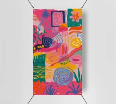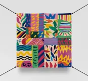 Un vivace e gioioso patchwork di vari motivi astratti e colori, tra cui fiori, strisce e forme geometriche, che creano un design tessile vivace ed energico.
