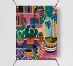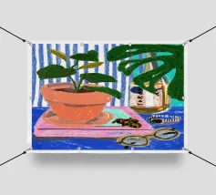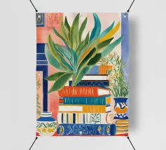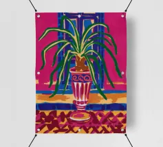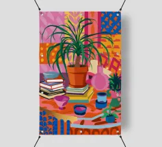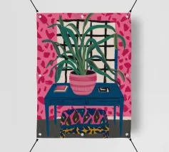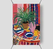 Natura morta di una pianta in vaso e di altri oggetti su un tavolo con un tappeto colorato e a fantasia al di sotto. La composizione su una parete rosa è moderna, eclettica e ricca di affascinanti dettagli decorativi.