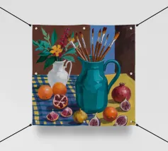 Un vivace barattolo di pennelli si trova alla luce del sole su un tavolo da studio, traboccante di potenziale artistico.
