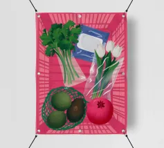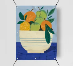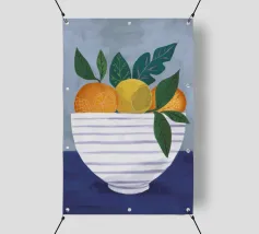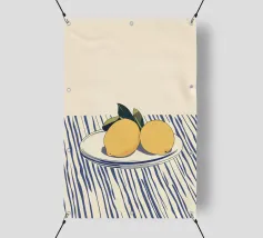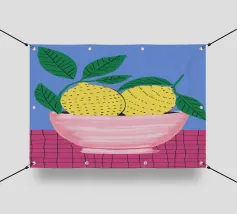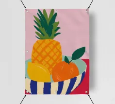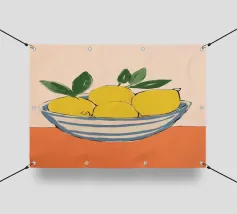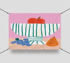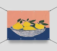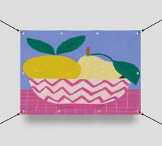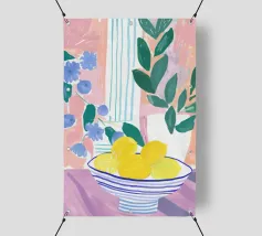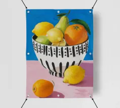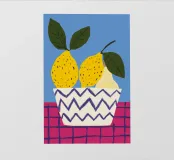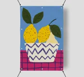 Una moderna natura morta di due pere gialle in una ciotola con un audace motivo a zig zag in bianco e nero. Lo sfondo a scacchi rosa e viola aggiunge un ulteriore livello di grafica giocosa alla composizione.