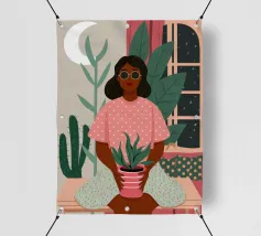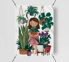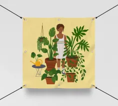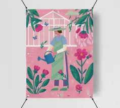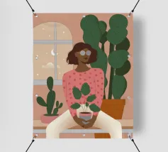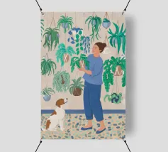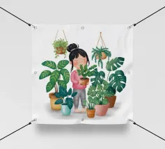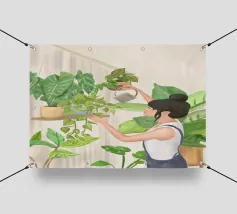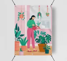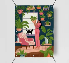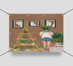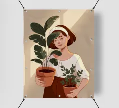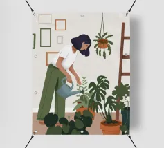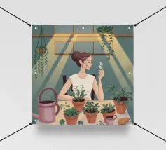 Una donna anziana cura le sue piante in una stanza dai toni tenui, esprimendo saggezza, calma e un legame senza tempo con la natura.