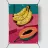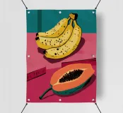 Un'illustrazione audace e ispirata alla pop art di banane e papaya su un piatto rosso brillante. I colori ad alto contrasto e lo stile grafico creano una dichiarazione vibrante e giocosa.