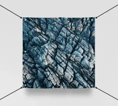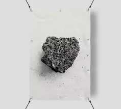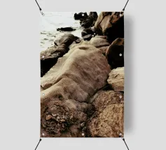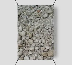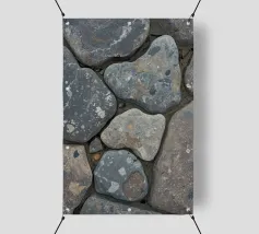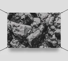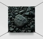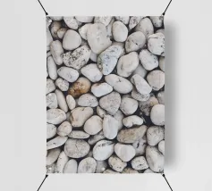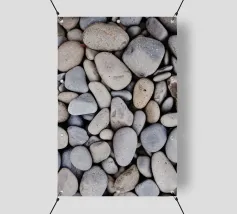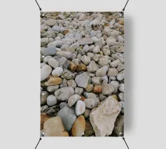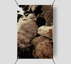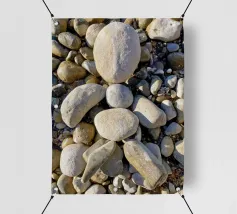 Rocce di varie forme e dimensioni sono adagiate su una spiaggia, con un'attenzione particolare a una pietra unica e strutturata. L'ambiente appare tranquillo, con la luce del crepuscolo che mette in risalto il paesaggio naturale.