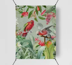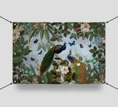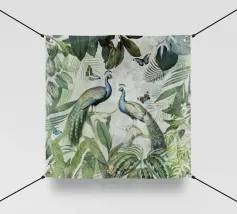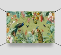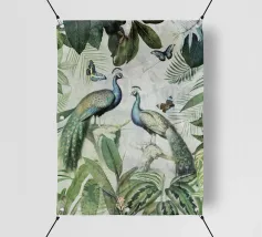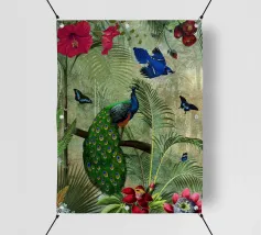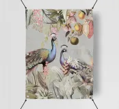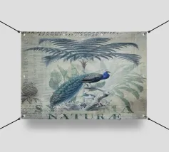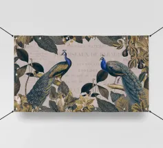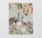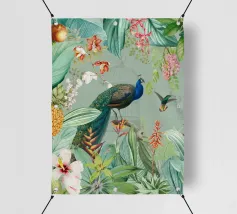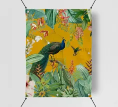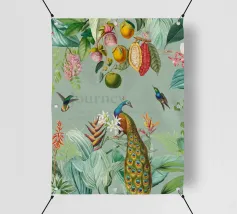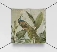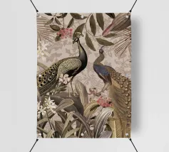 Questo collage vintage cattura l'eleganza dei tropici con una splendida composizione di lussureggianti foglie tropicali e frutti vivaci. Al centro, due splendidi pavoni si ergono con grazia, con le loro piume iridescenti che brillano nei toni del blu, del verde e dell'oro. Il maestoso piumaggio dei pavoni contrasta con il ricco fogliame, aggiungendo un senso di raffinata bellezza. Le sottili texture vintage dello sfondo esaltano l'eleganza generale, mentre i colori vibranti delle foglie e dei frutti danno vita alla scena, evocando un paradiso esotico senza tempo.