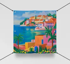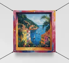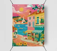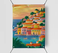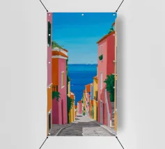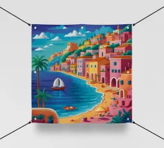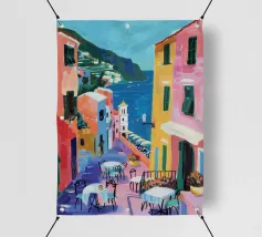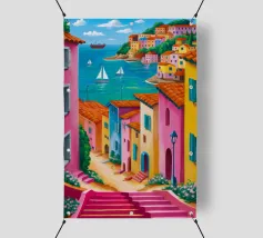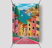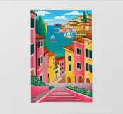 Una bella illustrazione di una lunga scalinata che scende tra le case colorate di una città costiera come Positano, verso il mare con le barche a vela. La scena è pittoresca, iconica e perfetta rappresentazione di un'estate italiana.