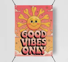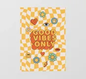 Riempite il vostro spazio di positività e stile con questa stampa digitale "Good Vibes Only". Questo vivace design grafico presenta il messaggio edificante in un testo arancione stratificato, su uno sfondo dinamico a scacchi gialli e bianchi, circondato da illustrazioni giocose di fiori sorridenti, cuori, emoji e altri simboli divertenti. L'immagine incarna un'estetica di ispirazione retrò, pensata per diffondere felicità e buone vibrazioni. Questa riproduzione digitale di alta qualità vanta una risoluzione di 7000x5000 pixel a 300 dpi, che garantisce una chiarezza eccezionale, linee nitide e colori brillanti. Una stampa ideale per