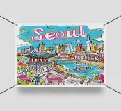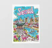 Questo poster vibrante e giocoso in stile cartone animato cattura l'energia dinamica di Seoul, Corea del Sud. L'opera d'arte presenta una stravagante miscela di punti di riferimento tradizionali e moderni, tra cui una porta storica, un fiume con un ponte e uno sfondo di grattacieli moderni e la torre di Seoul. L'illustrazione è ricca di linee decise e di una tavolozza di colori vivaci e allegri, che le conferiscono un'atmosfera divertente ed energica. L'affascinante testo "Seoul" scritto a mano e i ghirigori giocosi aggiungono un'estetica artistica e creativa. Questo poster digitale di alta qualità (7000x5000 pixel, 300 dpi) è un'opera d'arte di prima qualità che le celeb