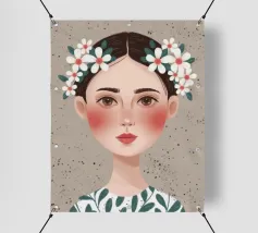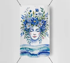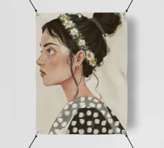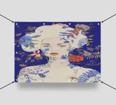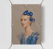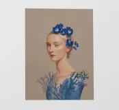 Delicato ritratto di profilo di una donna dalla pelle chiara e dai capelli chiari ornati di fiori blu, che indossa un abito blu strutturato che fa pensare a piume o a un tessuto morbido.