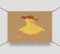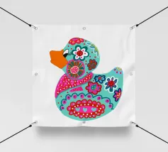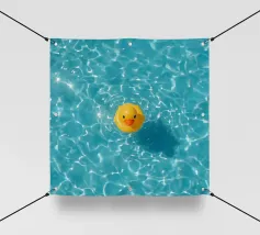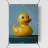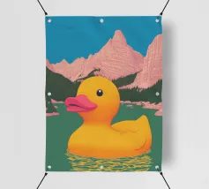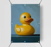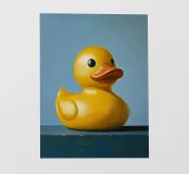 Un'illustrazione altamente dettagliata e realistica di un'anatra di gomma gialla brillante seduta su un morbido sfondo blu. La finitura lucida e i colori vivaci evidenziano il suo carattere allegro e giocoso.