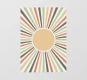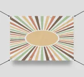 Linee radianti in tonalità terrose come il verde, il marrone e l'arancione si estendono da un cerchio centrale, creando un effetto a raggiera. Il design è caratterizzato da un'estetica retrò con motivi simmetrici e una tavolozza di colori rilassanti.