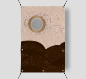 Splendido paesaggio astratto dall'effetto metallico, con un sole brillante in argento e oro con raggi solari disegnati con punti grigi e bianchi e colline scintillanti in marrone, su uno sfondo beige.