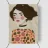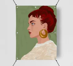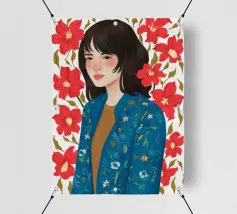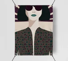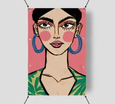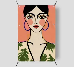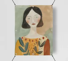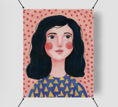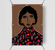Il dipinto raffigura una persona con capelli corti e scuri acconciati a onde, che indossa un abito con motivi retrò e cerchi e diamanti nei toni del rosa, del marrone e del beige. Lo sfondo è di un semplice colore beige chiaro.