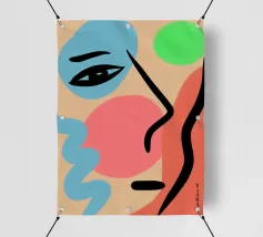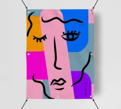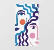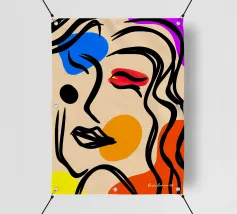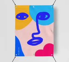 Il ritratto astratto di un volto è creato con linee blu fluide e ondulate su uno sfondo bicolore, dando vita a un'opera d'arte fluida, espressiva e moderna.
