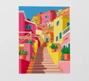 Una ripida scalinata colorata funge da strada in una città mediterranea, fiancheggiata da edifici di colore giallo, arancione e rosa, ornati da piante verdi in vaso.